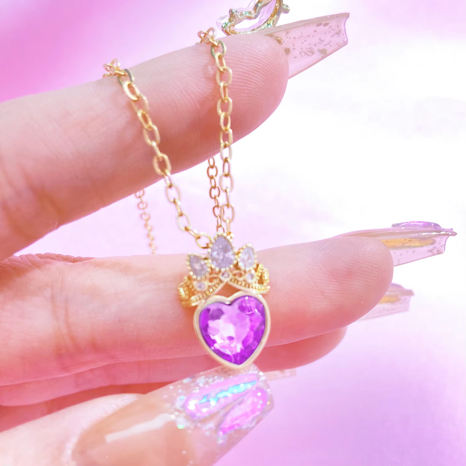 Elegant Purple Heart Pendant Necklace - Crown & Crystal Inlaid Hollow Design | Dainty Collarbone Chain for Women