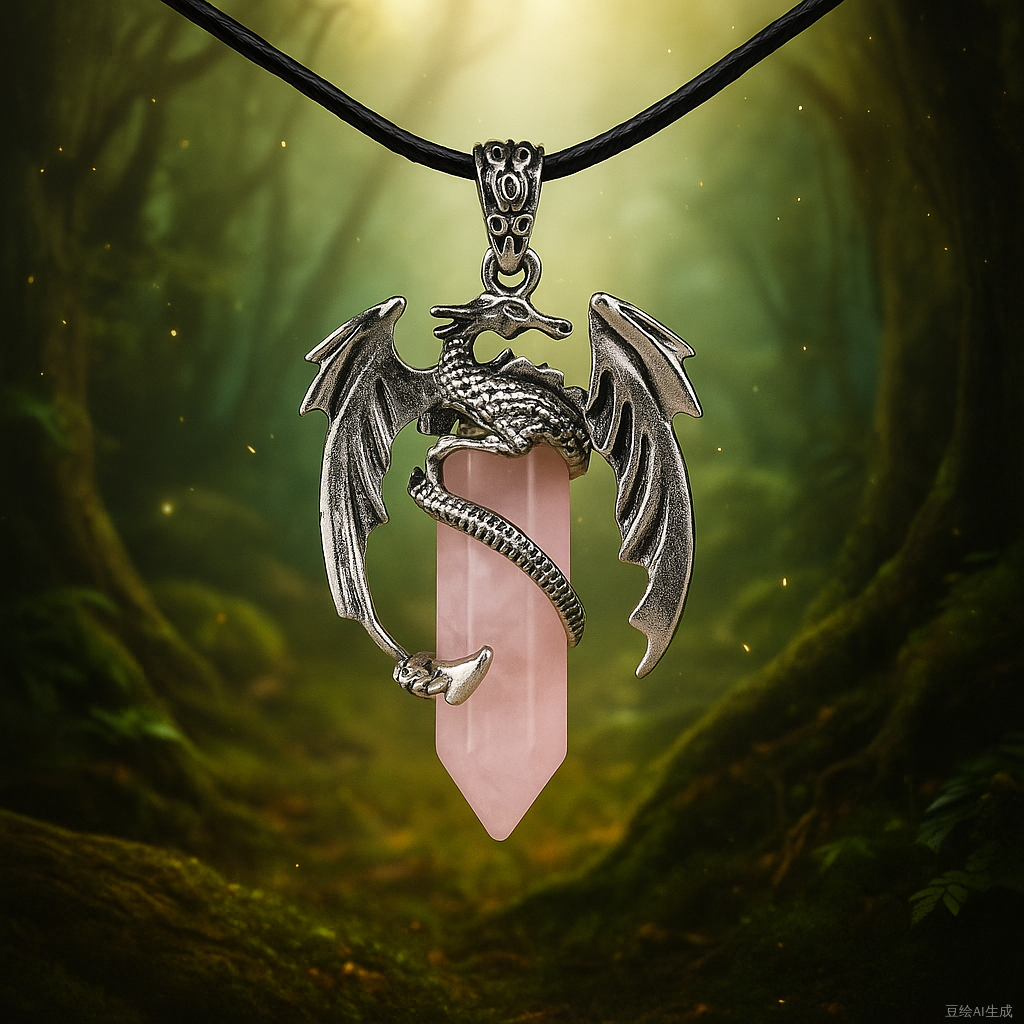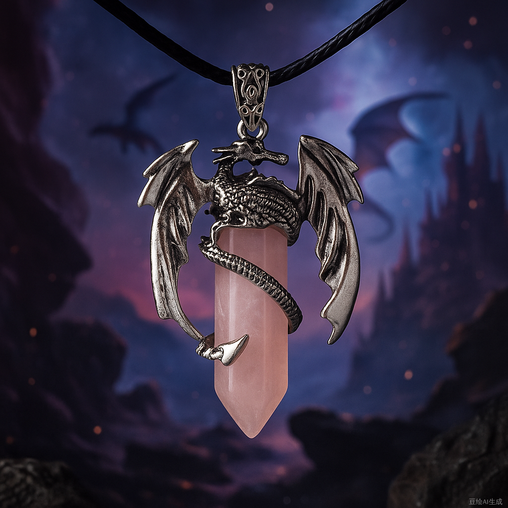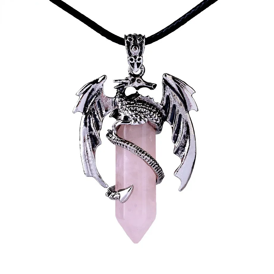 Natural Hexagonal Double-Pointed Retro Pterosaur Pendant Crystal Necklace, Flying Dragon Wrapped Pendant Jewelry