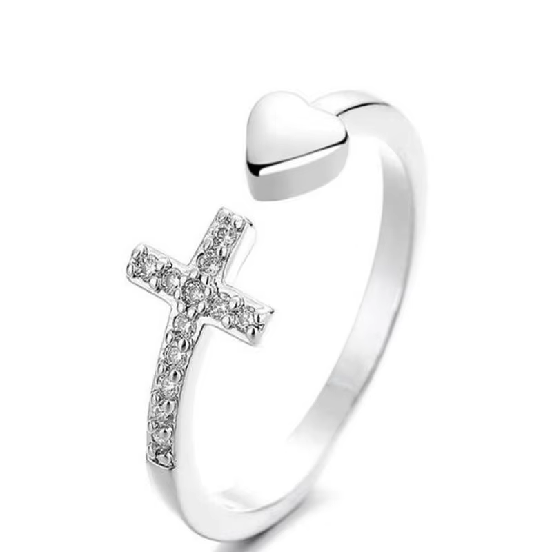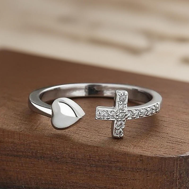 Trendy Cross & Heart Open Ring for Women - Crystal Inlaid Fashion Jewelry