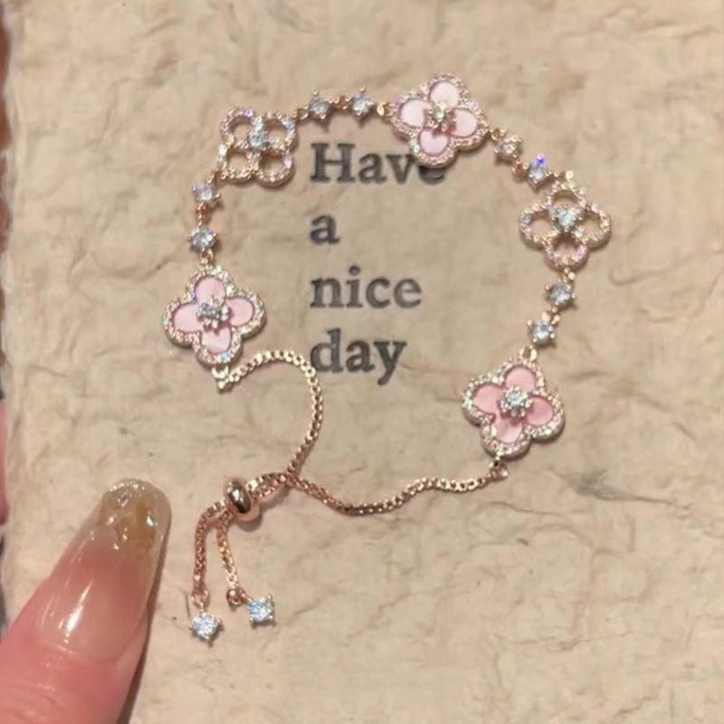 ✨ Delicate Clover Charm Bracelet for Women - Sparkling Zircon & Faux Pink Shell Hollow Design | New Year Luxury Jewelry