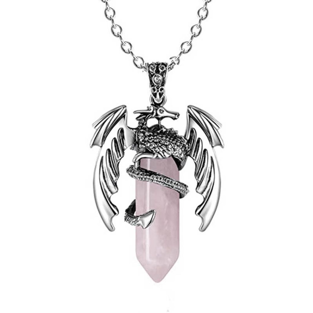 Natural Hexagonal Double-Pointed Retro Pterosaur Pendant Crystal Necklace, Flying Dragon Wrapped Pendant Jewelry