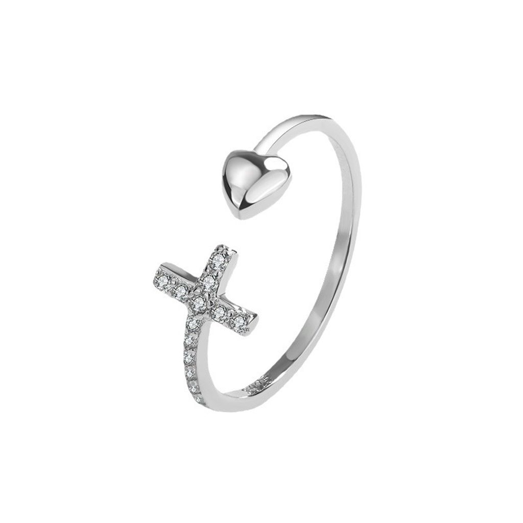 Trendy Cross & Heart Open Ring for Women - Crystal Inlaid Fashion Jewelry
